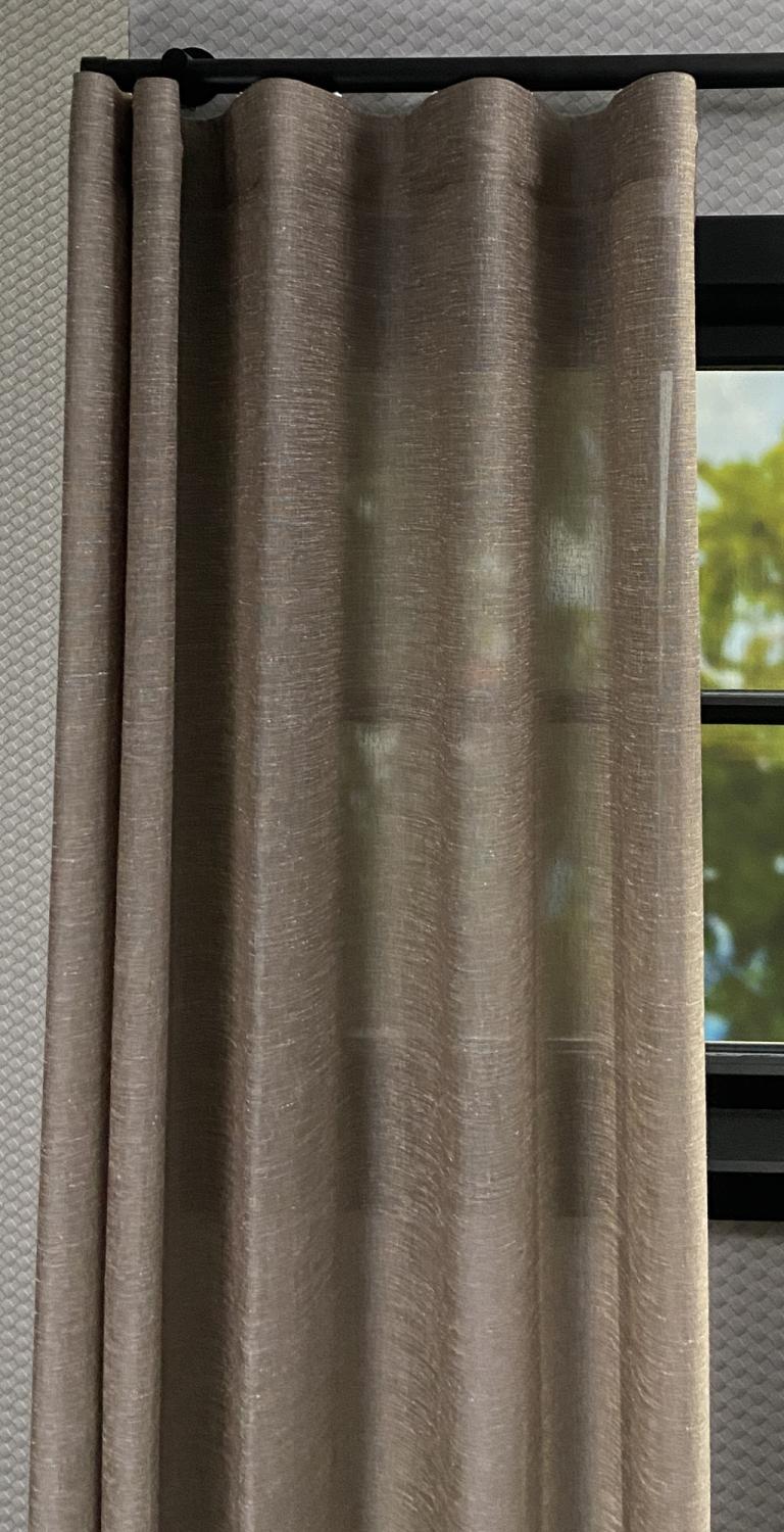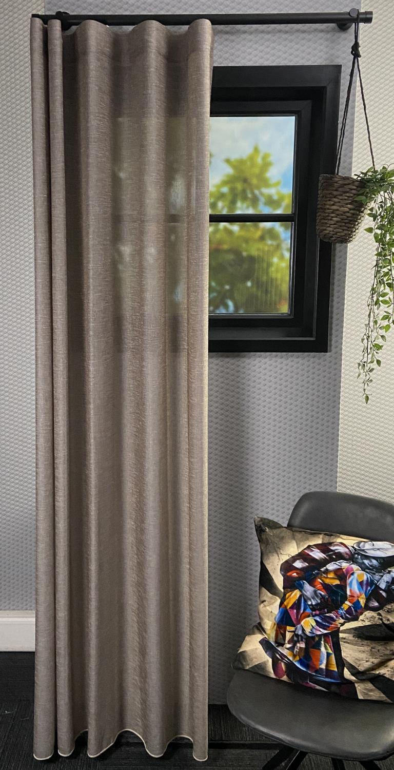 In deze moderne inbetween is een klein gedeelte linnen verwerkt, hierdoor krijgt het gordijn een hele natuurlijke uitstraling. Door het gebruik van verschillende kleuren garens bij het weven van de stof krijg je het echte linnen effect, en ook de bijbehorende knoopjes zoals bij echt linnen, ontbreken niet in deze inbetween. Wij adviseren de onderzijde van het gordijn af te werken met een zoom, dit geeft het gordijn een luxe uitstraling.