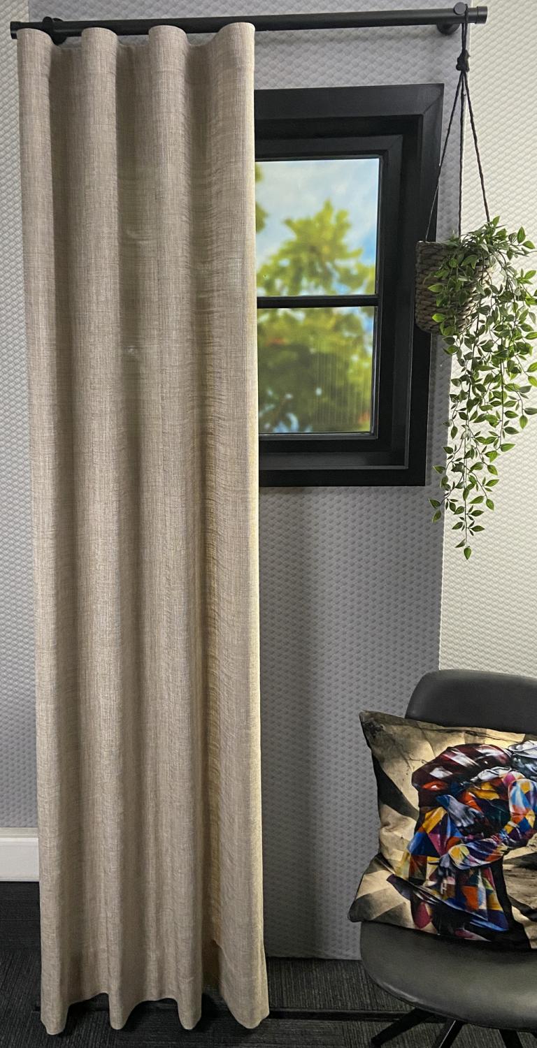 Gordijnstof Vernum is kamerhoog (300 cm) en kan probleemloos geconfectioneerd worden tot een hoogte van 290 cm. Voor het mooiste resultaat raden we een wave plooi of dubbele plooi aan. Onze gordijnen worden volledig op maat gemaakt, zodat ze perfect aansluiten bij jouw interieur en stijl.
