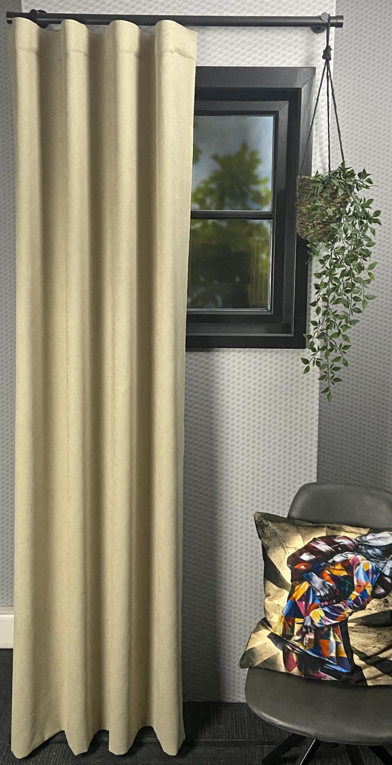 Gordijnstof Media is een hoogwaardige velvet-achtige stof met een soepele weving, waardoor het gordijn perfect in de plooi valt. De zachte voorkant met subtiele vleug geeft een chique en warme uitstraling, terwijl de achterkant kleurend is aan de voorzijde voor een harmonieuze afwerking. Dankzij de kamerhoogte van 300 cm kunnen we gordijnen tot 290 cm hoog naadloos confectioneren, wat zorgt voor een luxe en strak resultaat.