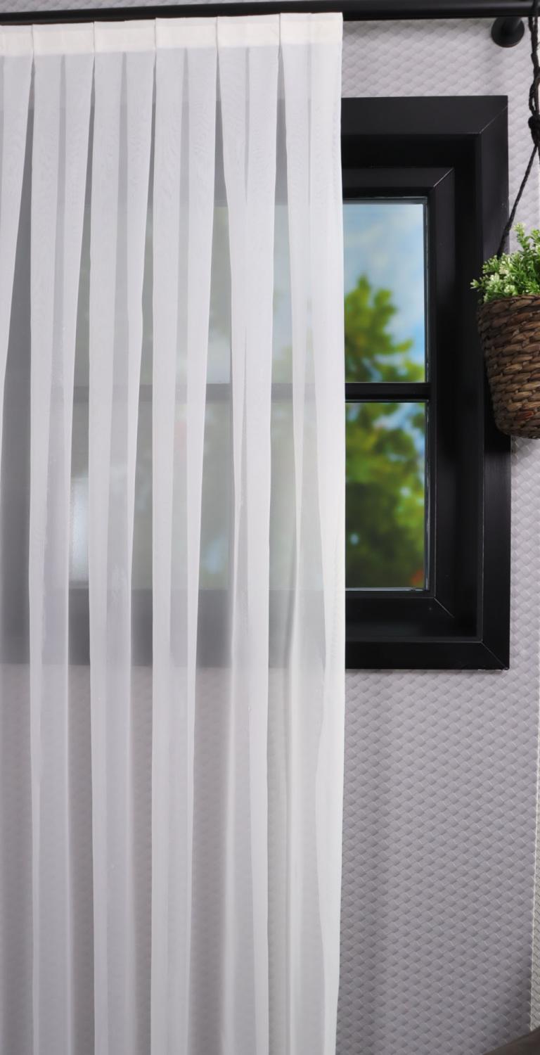 Vitrage Alyssa wordt volledig op maat gemaakt, zodat het perfect past in jouw interieur. Met een kamerhoogte van 290 cm kunnen we gordijnen confectioneren tot een hoogte van 280 cm, zonder naden in het zicht. Kies voor een dubbele plooi en loodveter voor een luxe en tijdloze afwerking, of ga voor een enkele plooi voor een subtiele en nonchalante look.